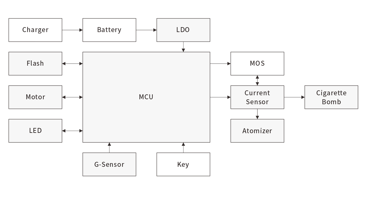 电子烟由主控芯片、锂电池、 按键、LED呼吸灯、雾化器等部件组成,通过Semiware的电路保护产品线组合,增加了电池过充电、过放电、发热装置短路的保护,以及防干烧、短路自恢复等功能,使用更加安全可靠。