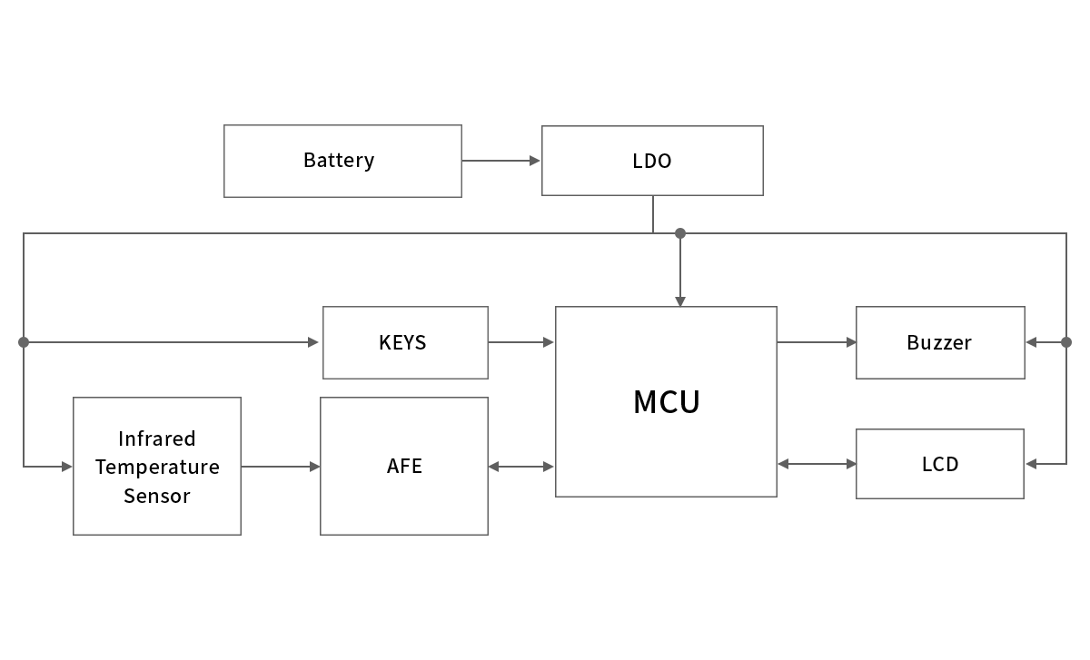 红外额温计核心芯片主要由ADC芯片和控制芯片设计组成,可实现按键控制、LCD显示、电量检测等功能。