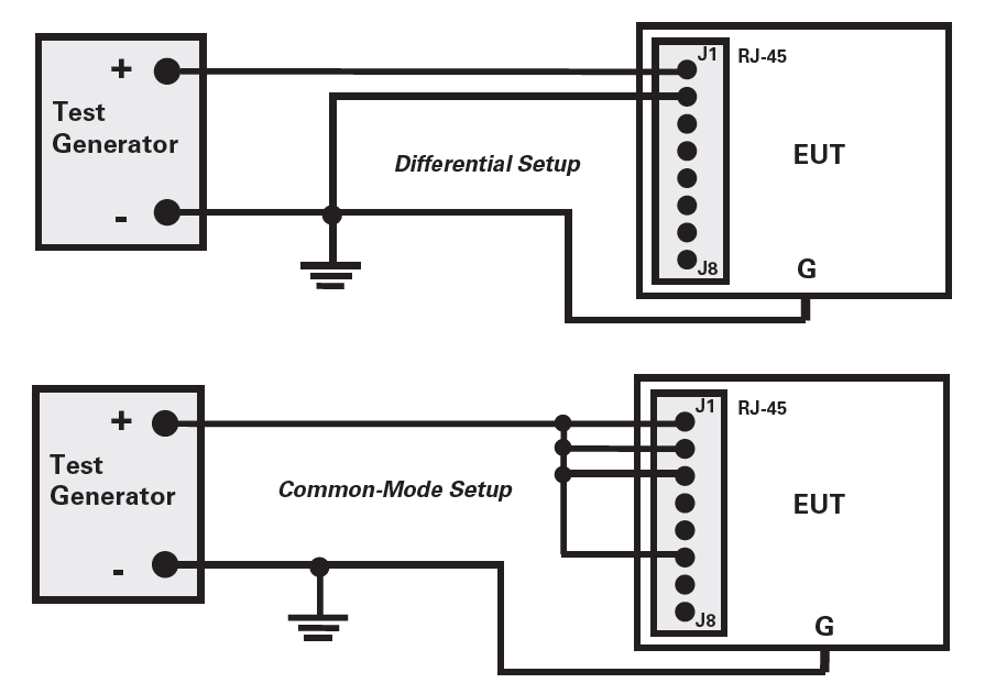 图2:以太网介面的差模和共模测试设置(仅用于快速以太网)