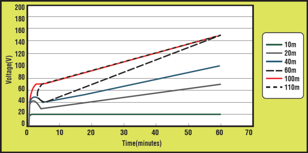 图4:不同长度的CAT5电缆随时间变化的电荷积聚情况