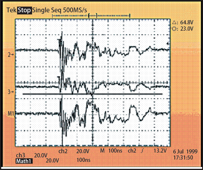 图5:在25英尺双绞电缆被充电至1.5千伏后, 在以太网PHY中显示多种CDE放电波形