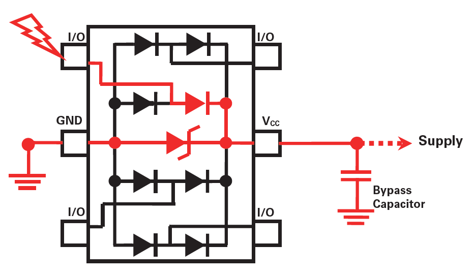 通过连接SRV05-4器件的Vcc引脚,由于电气瞬变将会经由的两条独立的放电路径(如图6中红色所示),设计人员将可获得更好的整体钳位。它可以简单地被认为是一个电阻分压器,瞬变通过控向二极管进入,并经由两条路径:一条由内部TVS至GND,另一条通过电源或一个外部旁路电容至GND。总而言之,将引脚5连接至电源会带来更好的钳位性能,为以太网PHY提供更好的整体保护。