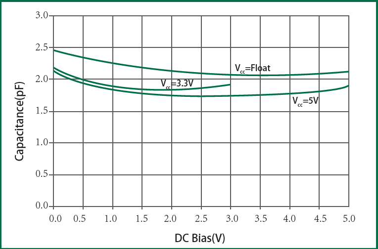 偏置这个Vcc引脚的另一个好处是其可以降低从I/O到GND的电容,这与使其保持浮动或不进行连接是完全不同的。应该参考用于保护以太网PHY的特定器件的数据手册,以为设计人员提供这个将部分依赖于Vcc偏置电平的电容。下面的图7是SESRV05-4的图示,仅供参考。