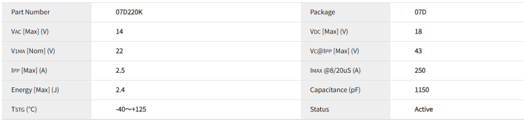• 07D:芯片直径约为7mm,表示其通流容量和能承受的浪涌能量等级。