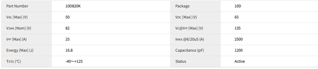 - 820K:标称电压为82V(820 * 10^1),电压误差为K档(±10%)。即其压敏电压范围为 74V 到 90V。