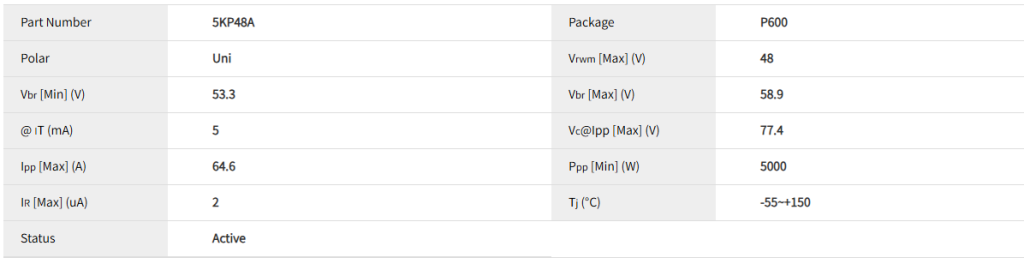 - 工作电压 VRWMVRWM: 48V,即电路正常工作的最大直流电压。应确保系统正常工作电压 ≤ VRWMVRWM。