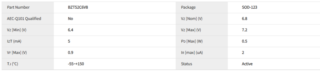 - 标称稳压值 Vz: 6.8V @ Izt (典型测试电流,通常为5mA)