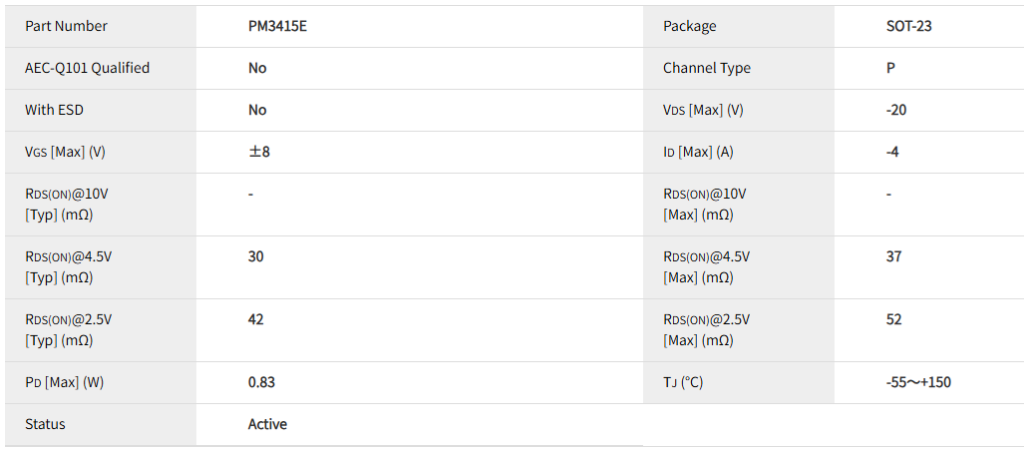 PM3415E 属于小信号 P-Channel MOSFET,主要特点如下: