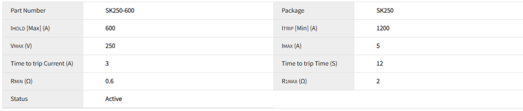 - 型号解读:SK250-600通常指在25°C环境温度下,保持电流(Ihold)为2.50A,触发电流(Itrip)为5.0A(一般为Ihold的2倍),最大工作电压为60V的PPTC。