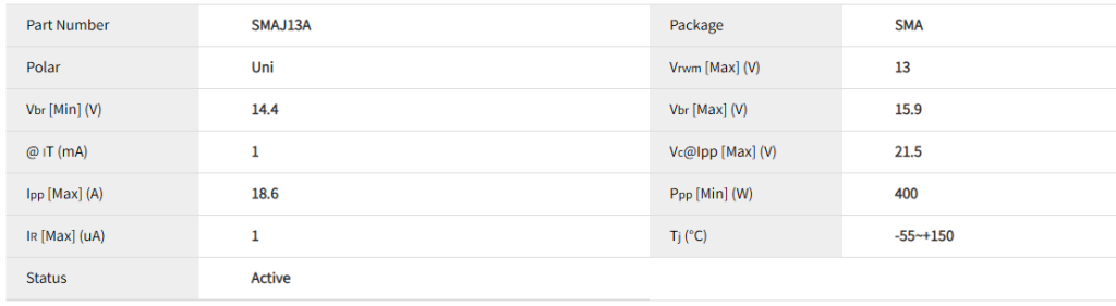 - 工作电压: 13.3V。这是它的反向截止电压(Stand-off Voltage),指在正常电路工作电压下,TVS 处于高阻状态,不影响电路。通常选择的 TVS 工作电压略高于电路的正常工作电压峰值。