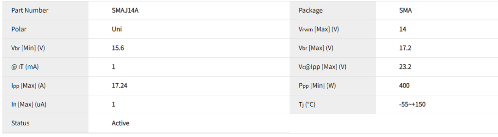 SMAJ14A 是一款适用于 14V 左右工作电压的直流系统的标准保护器件。它的 24.4V 最大钳位电压 和 400W 的脉冲功率 能力,使其能够有效吸收中等强度的瞬时过电压,保护后级的IC和电路。