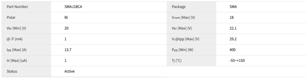 - 系统电压:12V (MAX ~14.4V) < VRWM (18V) -> 符合