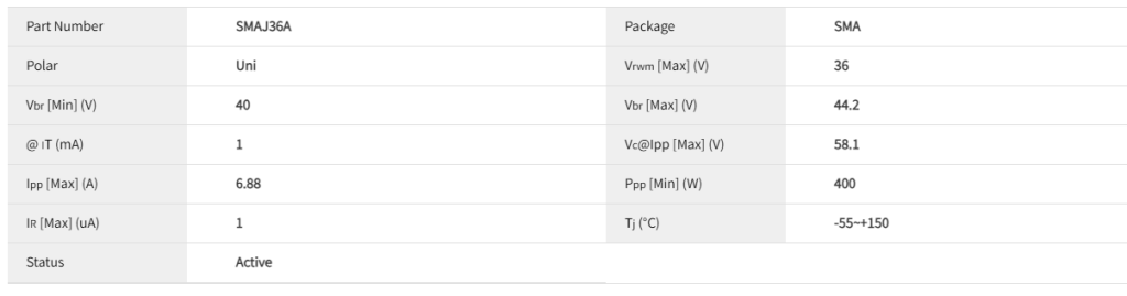 - 工作电压匹配:我的电路最大持续工作电压是否 < TVS的VRWM(36V)?