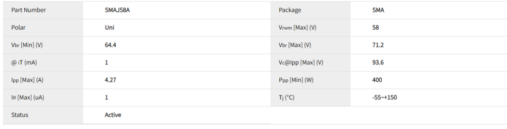 - 结论: SMAJ58A适用于能量较小的瞬态事件,如低等级的雷击浪涌、感性负载切换、ESD等。对于严酷的工业浪涌,需要选择更高功率的TVS,如SMCJ58A(1500W)、5.0SMDJ58A(5000W)或使用专门的浪涌保护器件。