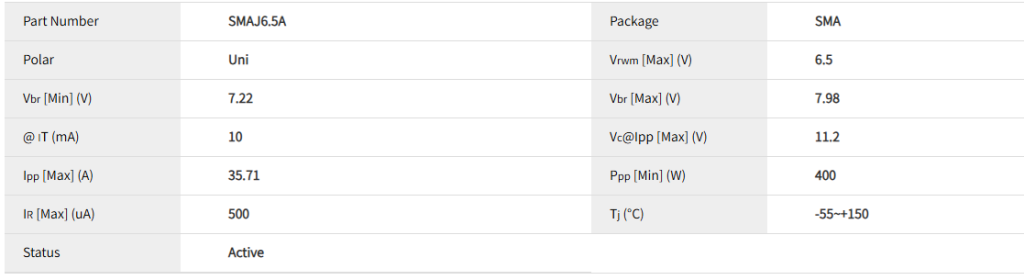SMAJ6.5A 是一款非常通用的低电压保护元件,主要用在需要防范过压、浪涌或静电的电子设备中。它的核心参数是 6.5V 的工作电压和 400W 的峰值脉冲功率,能快速响应并钳位异常高电压,保护后端电路。