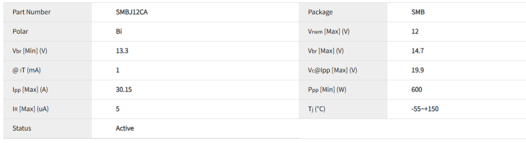 - 假设你的直流电路正常工作电压为 12V。选择 Vrwm = 12V 的 TVS(SMBJ12CA)是合适的。如果系统有波动或噪声,建议选择 Vrwm = 15V 或更高(如 SMBJ15CA),以避免误触发。