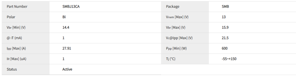 - 验证: 查数据手册,看SMBJ13CA在相应测试等级下能否承受对应的峰值脉冲电流。SMBJ系列通常能应对中等强度的浪涌。