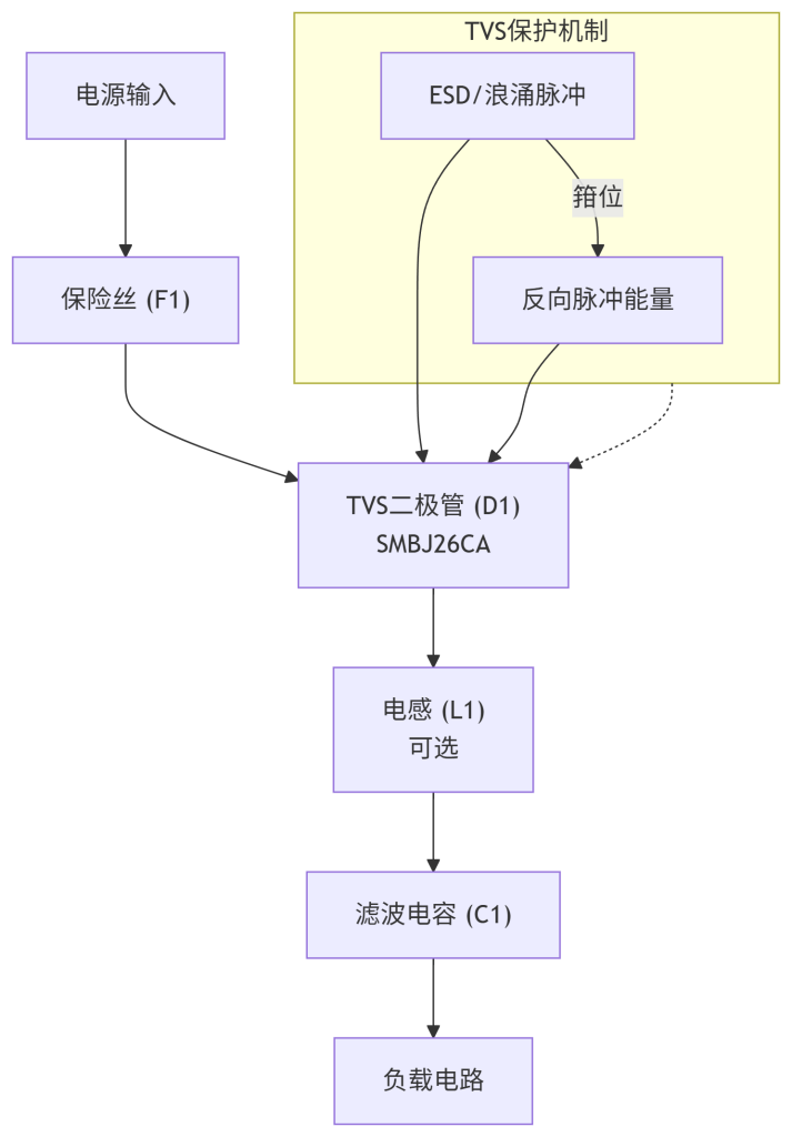 - 路径: 电源输入 → 保险丝F1 → TVS二极管D1 → 磁珠L1 → 滤波储能电容C1/C2 → 受保护的负载电路。