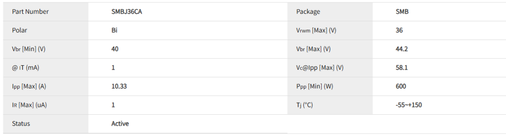 - 反向截止电压(Working Standoff Voltage, V_RWM): 36V。这是它在电路正常工作时需要承受的最大直流或连续峰值电压。电路的工作电压应低于此值。