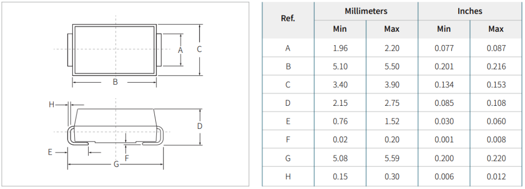 - 封装: SMB(DO-214AA),一种表面贴装封装,尺寸适中,功率处理能力较好。
