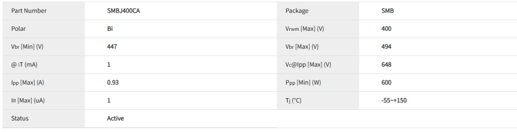 Pppm和Ipp能满足要求。对于复杂或高能浪涌,可能需要多级防护(如气体放电管GDT在前,TVS在后)。 - 寄生电容考虑:SMBJ400CA的结电容通常在几十到几百皮法量级。对于高速数据线(如USB3.0、HDMI),此电容可能引起信号完整性問題,需选择低电容TVS或采用其他方案。