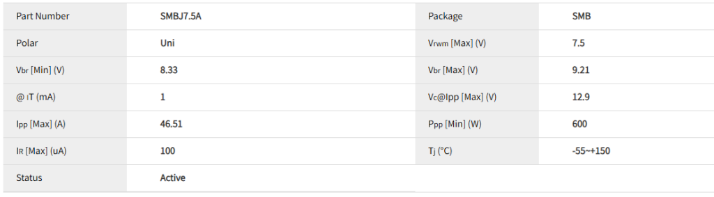 - 工作电压 (Stand-off Voltage): 7.5V - 这是器件在电路正常工作时承受的电压。它应略高于被保护线路的正常工作电压。例如,常用于保护 5V 的逻辑电路或电源线。