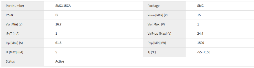 - 15: 反向断态电压(VRWM)为15V。这意味着在15V及以下电压时,TVS呈现高阻态,对电路基本无影响。选择此TVS的电路正常工作电压应≤15V。