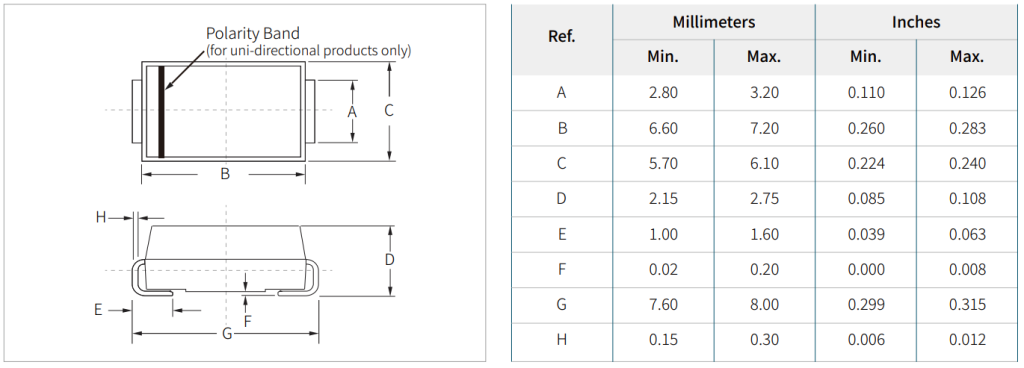 - SMC: 封装形式(DO-214AB),功率较大,比SMA、SMB封装能承受更高的瞬态功率。